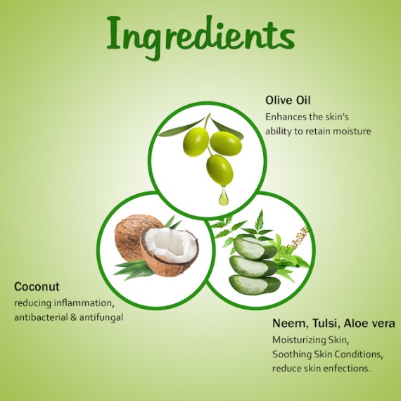The antibacterial properties of Neem and Tulsi keep your skin free of germs causing irritation. Aloe Vera has soothing power and the three of them together heals any kind of skin inflammation or irritation
